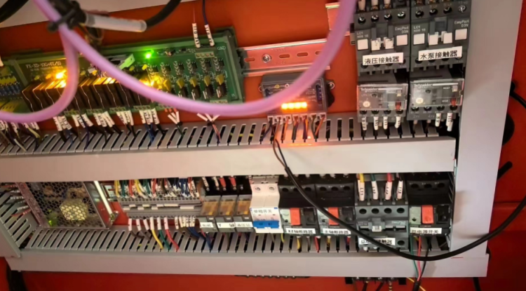 1、液壓站無(wú)反應(yīng),無(wú)壓力。我們檢查電箱,液壓站的控制器電路正常,繼電器正常工作,但是液壓站沒(méi)有反壓,電機(jī)不轉(zhuǎn),初步判斷是液壓站電機(jī)沒(méi)有進(jìn)電,這里我們首先去檢查了繼電器,工作正常,判斷有可能急停開關(guān)的控制有問(wèn)題,急停后液壓站會(huì)不工作,我們拆看面板發(fā)現(xiàn)面板的急停開關(guān)無(wú)異常,后檢查電箱發(fā)現(xiàn)確實(shí)是信號(hào)線路松脫,拔插過(guò)后問(wèn)題解決。
